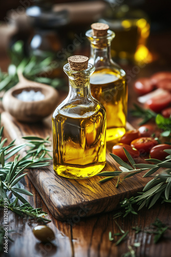 Olive Oil and Herbs. Bottle of olive oil with rosemary. Beautiful Kitchen Scene