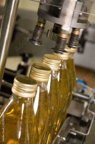olive oil, factory, conveyer belt, filling, cardboard box, bottle, cooking oil, industry, automated, concept, food, food and drink, horizontal, in a row, no people, photo, selective focus, yellow