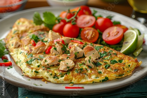 Omelette stuffed with chicken, tomatoes and herbs served with fresh salad