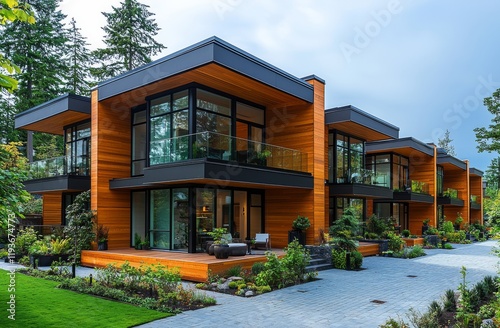 On a bright summer day, the architecture details of a newly constructed apartment building in a residential area are on full display