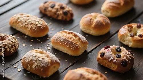 On a dark wooden countertop, various baked breads decorated with grains and dried fruits are placed, presenting a rich and delicious visual feast.