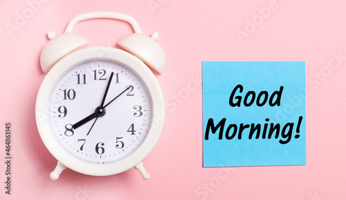 On a light pink background, a white alarm clock and a blue sheet of paper with the text GOOD MORNING