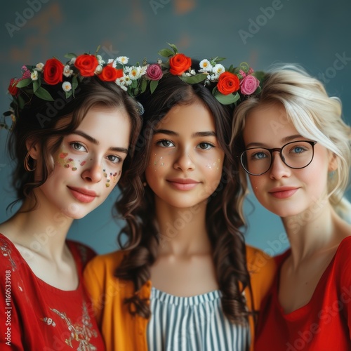 sister, smiling, crown, flower, girl, plain, background, portrait, cheerful, illustration, floral, decorative, joyful, creative, natural, feminine, beauty, harmony, colourful, family, people, daughter, woman, love, smile, fun, baby, happiness, friendship, friends, three, friends, together, teenage, fashion, face, sister, youth, model, party, brunette, make-up, mother, children, hair