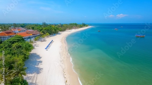 On a tropical island paradise, clear blue waters caress the flawless sandy beaches.