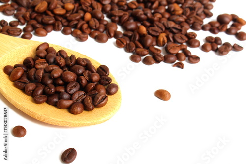 On a white background lies a wooden spoon with coffee beans.