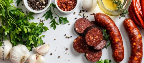 On a white table, there are homemade chorizo and black pudding alongside fresh food ingredients and onions.