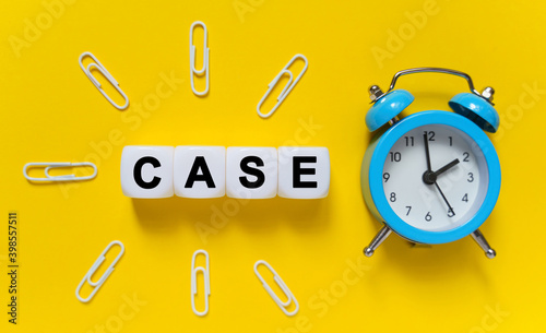 On a yellow background, a blue alarm clock, paper clips and white cubes on which the text is written - CASE