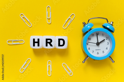 On a yellow background, a blue alarm clock, paper clips and white cubes on which the text is written - HRD