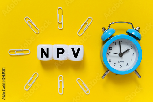 On a yellow background, a blue alarm clock, paper clips and white cubes on which the text is written - NPV