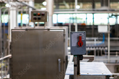 on and off industrial red switch in on position selective focus, packaging machine, belt conveyor system brewhouse brewery factory machines background