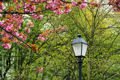 on the right, a black metal street lamp stands with a park among green trees and branches with pink sakura flowers in the park on a sunny day. side view