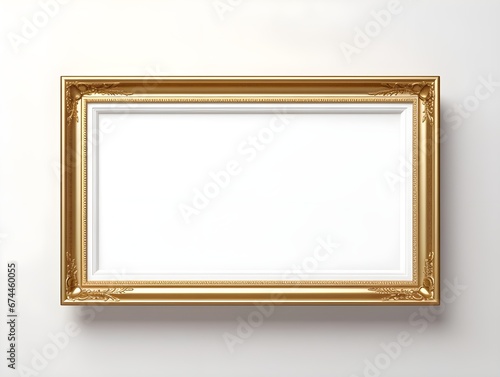 On the wall of an auction house or museum display, an ancient golden art fair gallery frame. Blank template with white copyspace for mockup design. Generative AI.