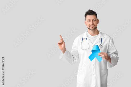 Oncologist with blue ribbon showing something on light background. Prostate cancer awareness concept