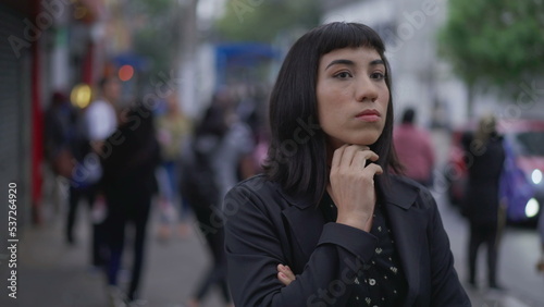 One anxious young hispanic woman standing in street feeling worry and anxiety. Businesswoman latina late waiting while feeling angst and preoccupation
