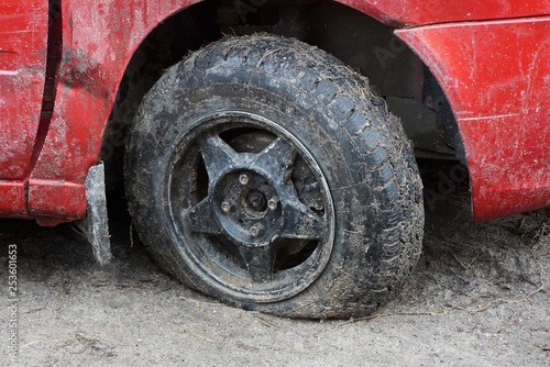 wheel, dirty, lowered, auto, land, dirt, 1, black, red, wing, grey, tire, car, transportation, vehicle, deflated, road, old, tyre, rubber, puncture, street, accident, flat, automobile, change, damage, detail, danger, air, service, burst, repair, rim, transport, hole, closeup, close, dangerous, truck, problem, break, worn, stop, safety, help, crash, broken