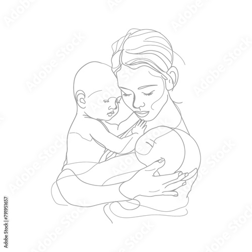 1, continuous, line, drawing, mother, holding, baby, black, colours, only