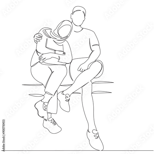 one continuous single drawn line art doodle couple, love, happy, muslim, people. isolated image hand-drawn outline on white background.