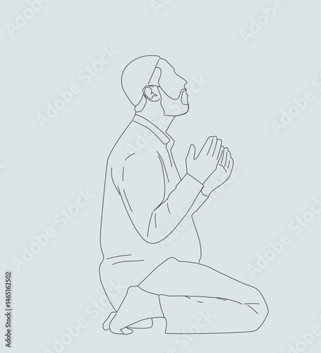 one drawing Muslim man praying on iftirasy kneeling sit gesture.