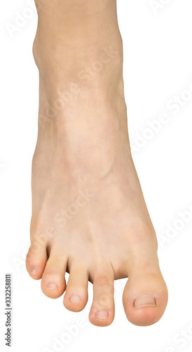 one female leg with spread fingers, standing on hips, front view, closeup, isolated on white background