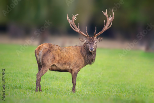 one handsome red deer buck stands in a meadow