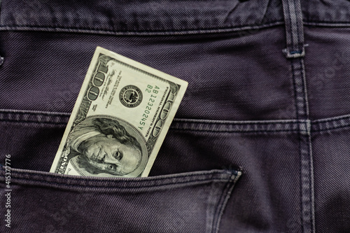 One hundred American Dollars Banknote in a jeans pocket on rotating table. Extreme close-up, Shallow Depth of Field. Business