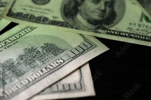 One hundred dollar bills on a dark surface close-up. Toned money background