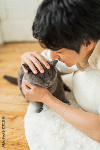 man, japanese, asian, cat, play, pet, domestic cat, lifestyle, people, 30s, home, work, work, personal computer, indoor, communication, house, workspace, waist up, smile, love, sweet