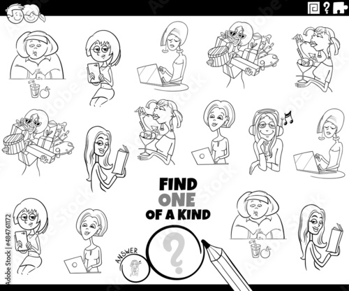 one of a kind, puzzle, education, task, activity, cartoon, illustration, workbook, game, preschool, 1, children, pastime, single, multiple, character, girl, woman, people, person, lifestyle, diversity, female, happy, colouring, book, page, black, white, design, vector, children, application, solution, drawing, picture, educational, graphic