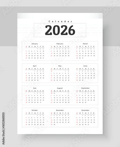 calendar, 2026, planner, year, white, vector, english, language, office, desk, business, 2025, template, seasonal, organiser, design, illustration, schedule, date, graphic, month, colourful, basic, daily, monthly, minimalist, minimal, week, modern, diary, annual, national, vacation, holiday, day, page, 1, off, new, time, wall, layout, december, event, july, print, sunday, weekly, new year