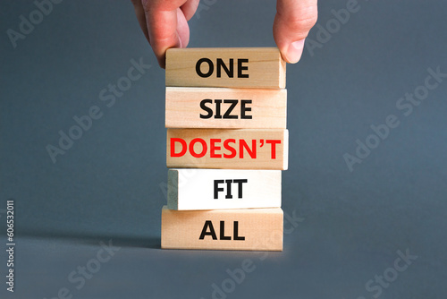 One size does not fit all symbol. Concept words One size does not fit all on wooden blocks. Businessman hand. Beautiful grey background. One size does not fit all business concept. Copy space.