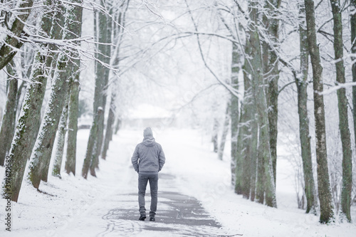 One young man in gray warm clothes walking through alley of trees in white snowy winter day at park after blizzard. Fresh first snow. Spending time alone in nature. Peaceful atmosphere. Back view.