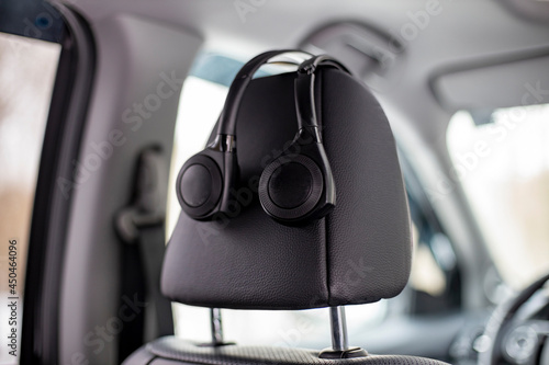 on-ear headphones hang on the headrest in the car. technology personal multimedia system in a modern premium car