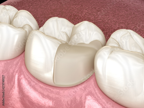 Onlay ceramic crown fixation over tooth. Medically accurate 3D illustration of human teeth treatment