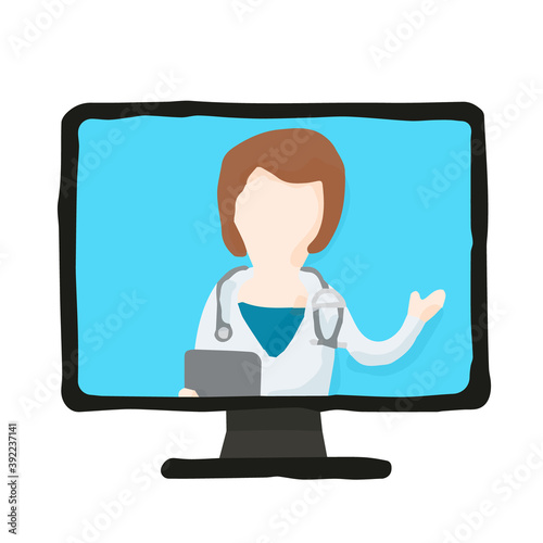 Online consultation with female doctor on computer monitor screen; Hand drawn vector illustration like woodblock print