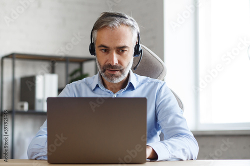Online education, remote working, home education. Portrait of grey-haired senior handsome man teaching online. Online meeting, video call, video conference, courses online.