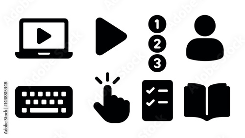 Online learning solid icons set – filled style education, e-learning, and digital tools symbols for virtual classrooms: laptop, play button, numbered list, user, keyboard, checklist, book.