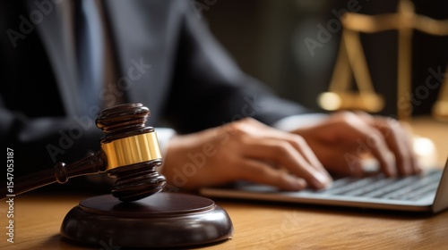 Online Legal Research Lawyer Typing on Laptop with Gavel Nearby