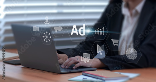 Online marketing and advertising on increasing sales concept. Businesswoman using laptop planning strategy for future business promotion on websites and social media for traffic and awareness.