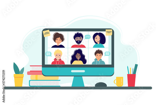 Online meeting via group call. Home office concept with computer, books and cup. Group of people doing video conference. Vector illustration in flat style. Stay at home. Self-isolation.