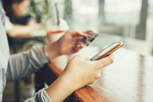 Online payment concept, Woman hands holding using cellphone and credit card for online shopping at coffee shop in the afternoon