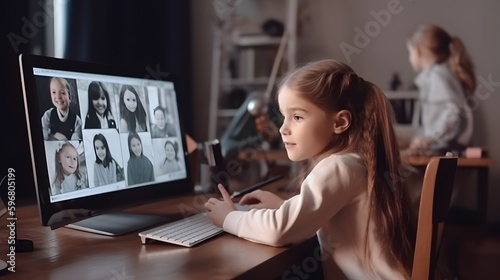 Online remote learning. School kids with computer having video conference chat with teacher and class group. Child studying from home. Generative Ai.
