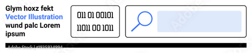 Online searching, data analysis, digital tools, programming, information systems, binary code. Magnifying glass over a search bar with binary numbers. Online searching and data analysis concept