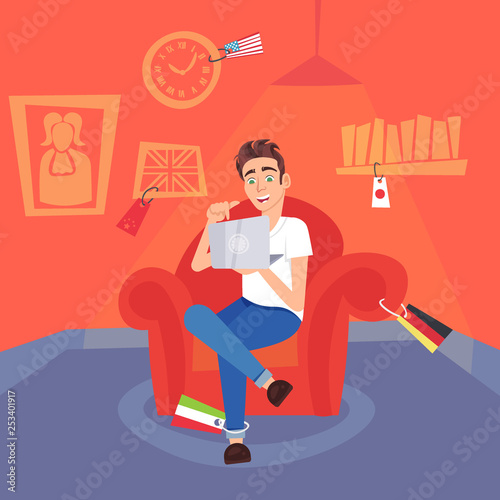 guy, man, smile, joy, flag, delivery, country, cyberspace, shopping, thing, home, interior, clothes, accessory, online