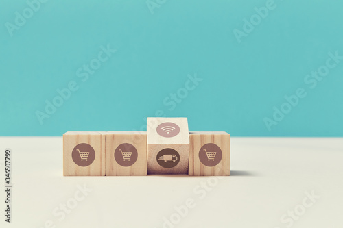 Online shopping and delivery. On-line store, supermarket. E-commerce. Wooden cubes in line, trolley, truck, wifi signs