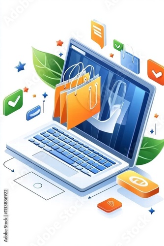 online shopping, e-business, laptop, computer, shopping bag, retail, technology, business, commerce, website, shopping cart, purchase, order, delivery, sale, discount, marketing, advertising, client, consumer, buyer, seller, e-business, customer service, laptop, notebook, innovation, digital, modern, graphic, design, illustration, isometric