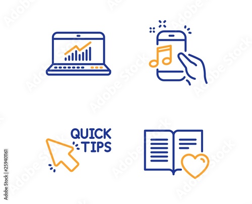 Online statistics, Quick tips and Music phone icons simple set. Love book sign. Computer data, Helpful tricks, Radio sound. Customer feedback. Education set. Linear online statistics icon. Vector