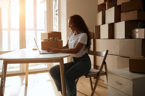Online store owners use a laptop to prepare parcels of clothing for shipping. Cheerful woman working in the office. Entrepreneur woman doing small e-commerce business