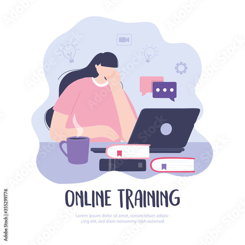 online, training, virtual, digital, course, lesson, teaching, workshop, college, conference, resource, distance, learning, school, screen, student, video, communication, development, education, flat, home, illustration, vector, information, girl, laptop, platform, web, study, intelligence, cyberspace, cognition, media, course, using, network, people, seminar, technology