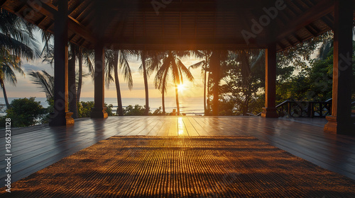 pavilion, wooden, open air, sunset, ocean, tropical, palm tree, serene, tranquil, nature, landscape, architecture, traditional, thai, relaxation, vacation, travel, scenic, horizon, sunlight, peaceful, retreat, exotic, coastal, view, idylli, floor, shadow, evening, calm
