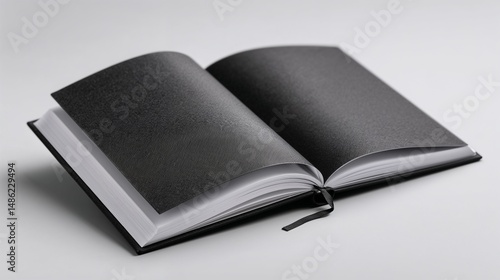 Open black book with textured cover on gray background